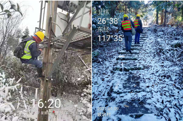 在三明,受气温骤降影响,部分光缆线路和监控设备出现故障,三明联通建宁建维网格人员快速行动,徒步登山踏雪排查,爬杆查看受损光缆,在雪地中历时4个多小时抢修,快速修复受损线路,并排除多个因冰冻造成监控设备出现的故障;在宁德,气温下降至零下5度,周宁七步苏家山网络出现预警,维护人员冒着严寒徒步踏雪,开展故障排查,第一时间处理修复故障;在龙岩,漳平拱桥至溪子口48芯光缆出现故障,龙岩联通维护人员快速响应,克服低温影响,排除故障影响,恢复通信。