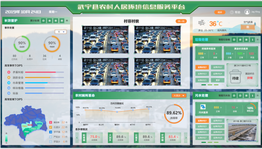 该平台利用“物联网、云计算、5G、AI”等先进技术,构建一中心(大数据研判中心)、两端(移动端、PC端)、三应用(环境监管、管护管理、公众服务)、四感知(物联感知、视频AI感知、网格定位感知、5G高速感知)的平台架构,解决农村人居环境在垃圾整治、污水治理、厕所革命、村容村貌管护工作中的责任监管不到位、基层管护存死角等问题,全面实现农村人居环境治理监管智能化、长效管护自动化。