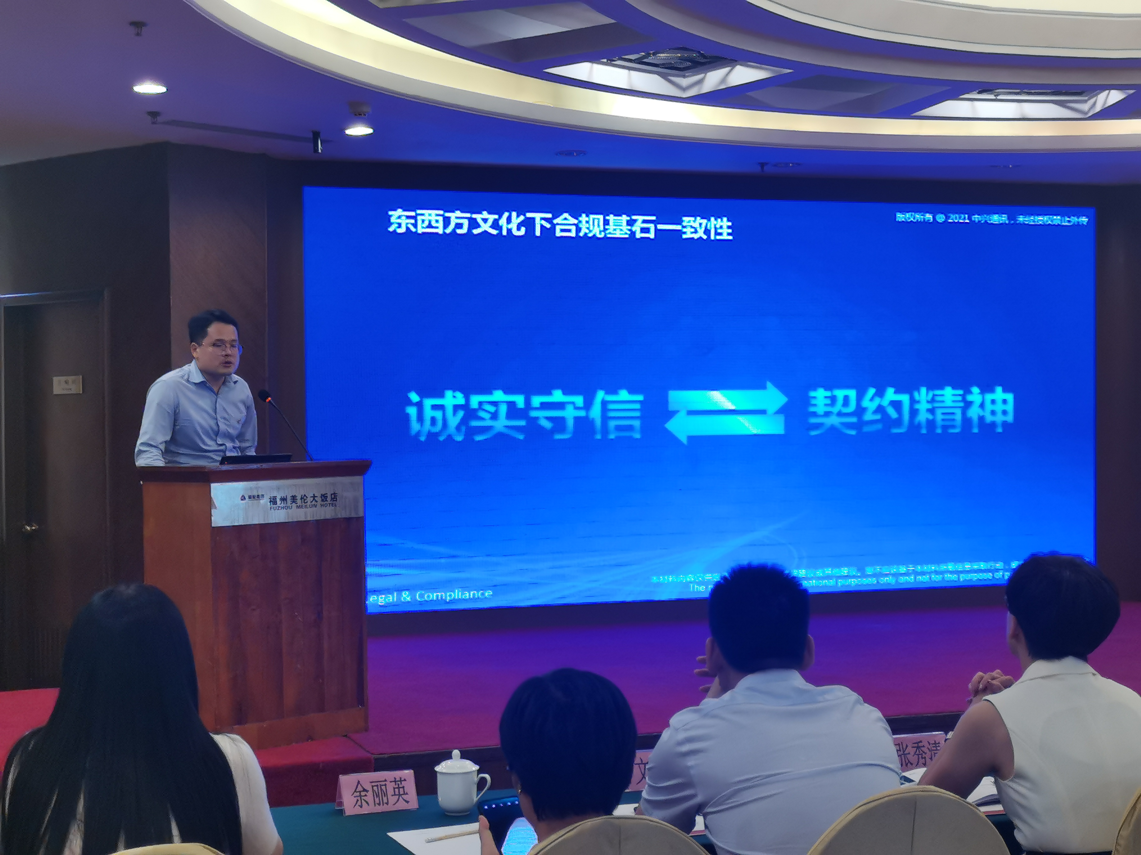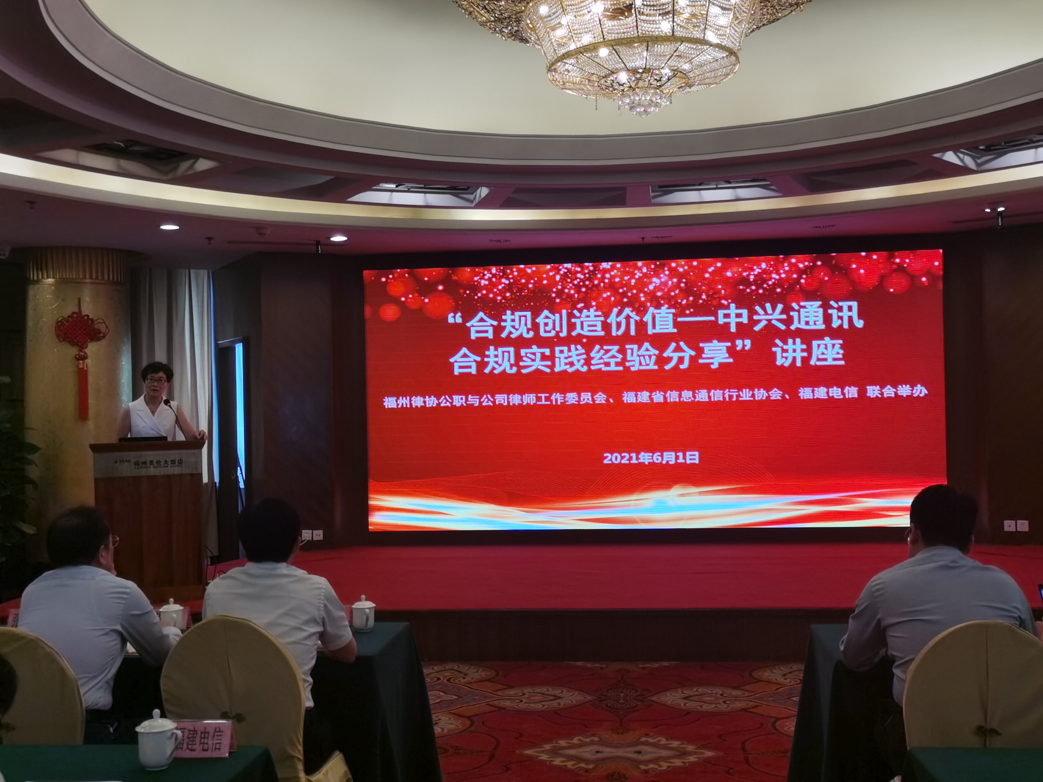 6月1日下午,省信息通信行业协会法制专委会联合福州律协公职与公司律师工作委员会共同举办了“合规创造价值-中兴通讯合规实践经验分享”讲座,邀请中兴通讯出口管制合规部合规总监郑伟伟、中兴通讯法律事务部高级法律合规经理张骥介绍中兴通讯合规实践经验。讲座由专委会张秀清主任主持,省信息通信行业协会黄惠彬秘书长出席了讲座。来自福建电信、福建移动、福建联通的法律人员以及福州律协公职与公司律师等近100人参加了本次讲座。