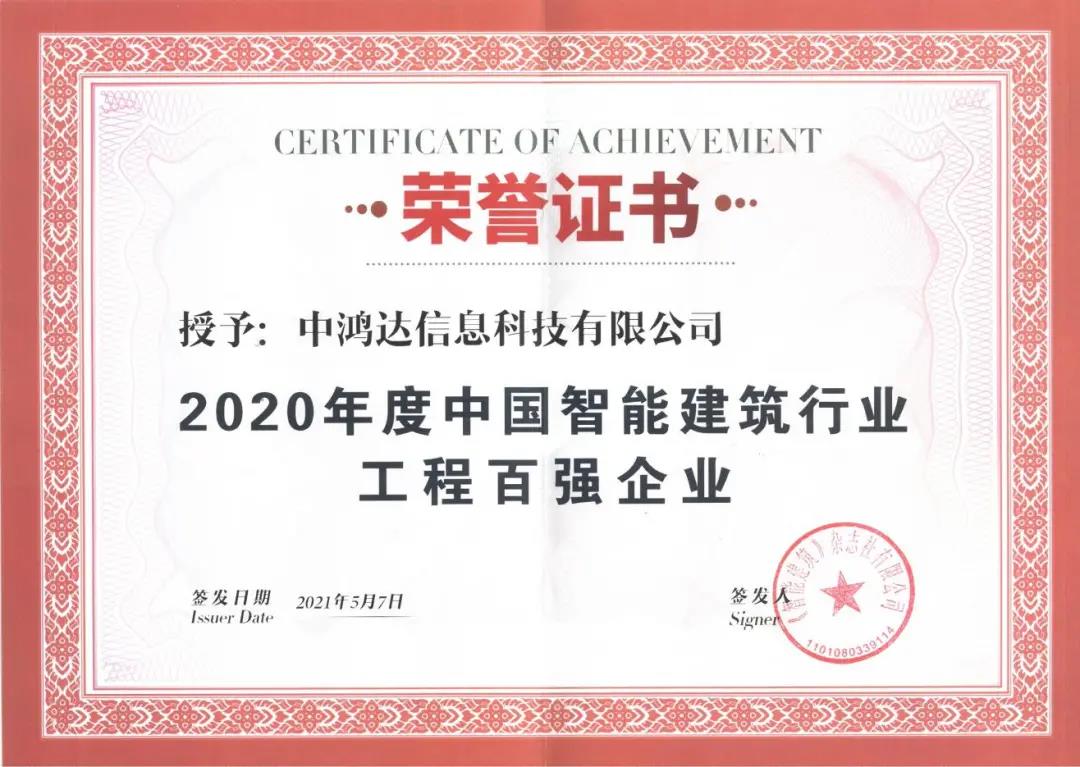 智能建筑杂志社于近期发布《关于公布2020年度中国智能建筑行业工程百强企业的通知》,中鸿达凭借长期积累沉淀的综合实力,荣获“2020年度中国智能建筑行业工程百强企业”称号,这已是公司第五次蝉联该奖项。