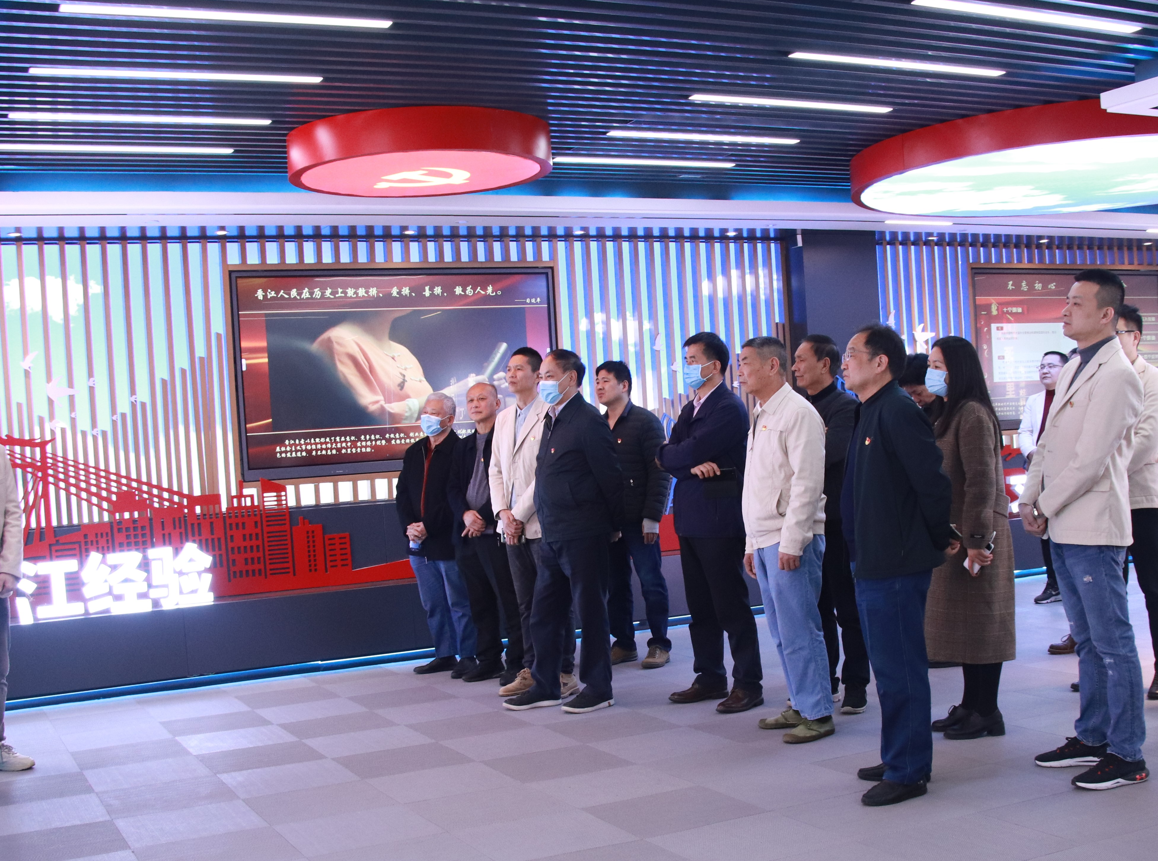 鸿官之路党建展馆,杨锦炎会长一行依次参观了《鸿源万里》、《鸿渐之翼》、《鸿鹄之志》、《鸿绩频传》、《鸿业远图》五个主题展厅,在看完展厅图文并茂的展示、听完讲解员对鸿官解放鞋精神、鸿官公司的发展史和公司党建发展历程的讲解后,全体人员对鸿官公司独有的“解放鞋精神”和“四个始终坚持”的企业文化深感触动,备受启迪,大家一致认为,党建工作为促进民营经济发展保驾护航,是推动民营经济发展的巨大动力。