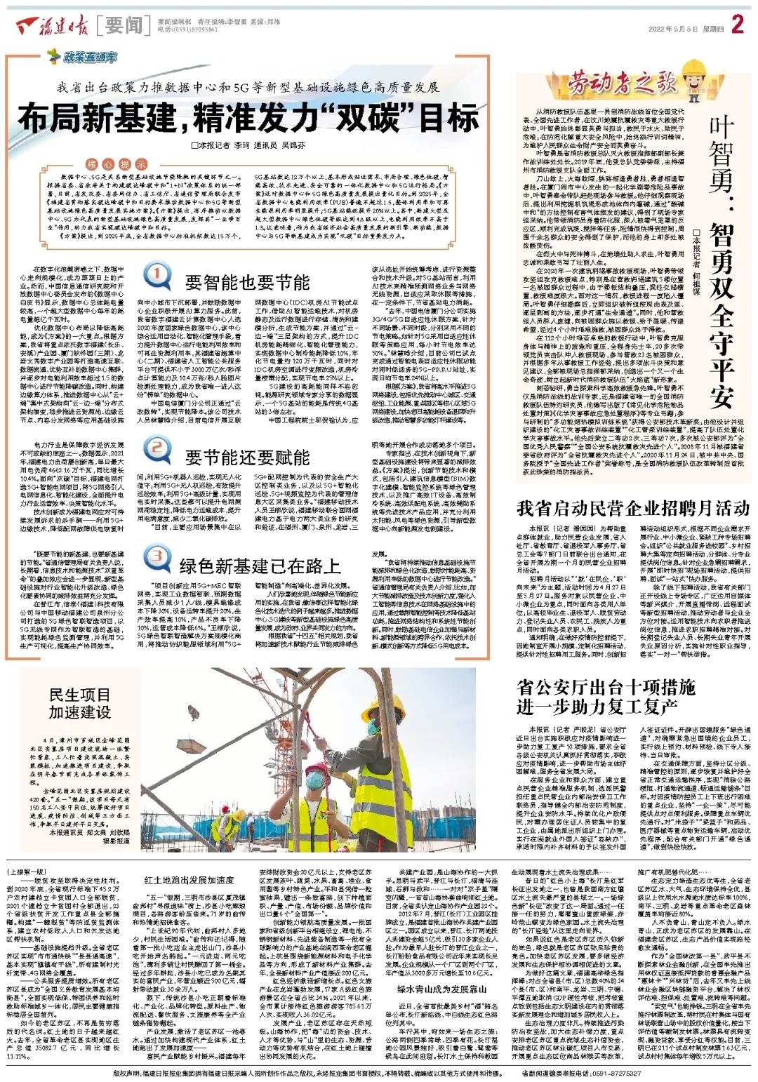 “既要节能的新基建,也要新基建的节能。”省通信管理局有关负责人说,长期看,信息技术和能源技术“双重革命”的叠加效应会进一步显现,新型基础设施对行业智能化升级改造、绿色化要素协同的减排效益将充分发挥。在晋江市,信泰(福建)科技有限公司与中国移动福建公司泉州分公司打造的5G绿色智联智造项目,以5G无线专网作为智联智造的基础,实现能耗绿色监测管理,并利用5G生产可视化,提高生产协同效率。“项目创新应用5G+MEC智联网络,实现工业数据智联,预期数据采集人员减少1人/线,模具维修成本下降30%,设备运转率提升20%,生产效率提高10%,产品不良率下降10%,运营成本降低6%。”王柳欣说,5G绿色智联智造解决方案规模化商用,将推动纺织鞋服领域利用“5G+智能制造”向高端化、差异化发展。人们欣喜地发现,伴随绿色节能新应用的实施,在我省,像信泰这样智能化绿色化技术迭代的例子越来越多。推进数据中心、5G建设等新型基础设施绿色高质量发展,成为政府、业界共同发力的方向。根据我省“十四五”相关规划,我省将加速新技术赋能行业节能减排绿色发展。“我省将持续推动信息基础设施节能减排和绿色化改造,鼓励对能耗高、资源利用率低的数据中心进行节能改造。”省通信管理局有关负责人介绍,比如,加大节能减排改造及技术创新力度,强化人工智能等信息技术在网络基础设施中的应用,通过载频智能控制等技术降低基站功耗,推进网络结构性和系统性节能创新。同时,鼓励基础电信企业加强与新材料、新能源领域的跨界合作,依托技术创新、模式创新等方式降低5G用电成本。