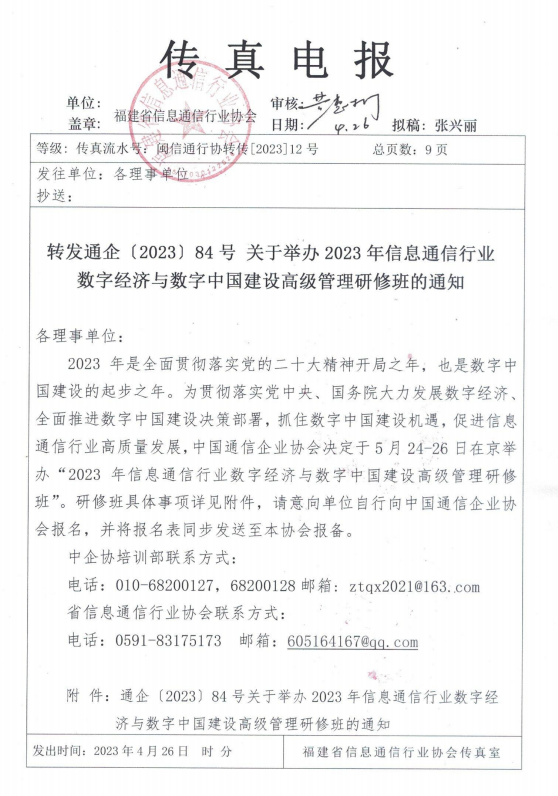 闽信通行协转传〔2023〕12号 通企〔2023〕84号关于举办2023年信息通信行业数字经济与数字中国建设高级管理研修班的通知