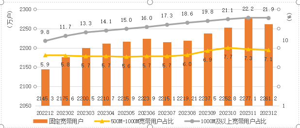 千兆宽带用户保持三位数以上高速增长。截至12月底,全省(固定)互联网宽带接入用户达2261.2万户,同比增长5.4%。其中,接入速率在500M和1000M之间的宽带用户160.1万户,同比增长26.1%,占总用户数的7.1%;接入速率在1000M及以上的宽带用户494.6万户,同比增长135.1%,占比21.9%。