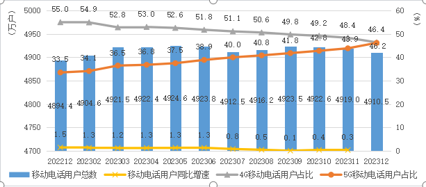 5G用户保持快速增长。截至12月底,全省电话用户达5581.5万户,同比增长0.1%,其中固定电话用户671万户,同比下降1.3%;移动电话用户4910.5万户,同比增长0.3%。5G移动电话用户达2268.7万户,同比增长38.3%,占移动电话用户总数的46.2%。