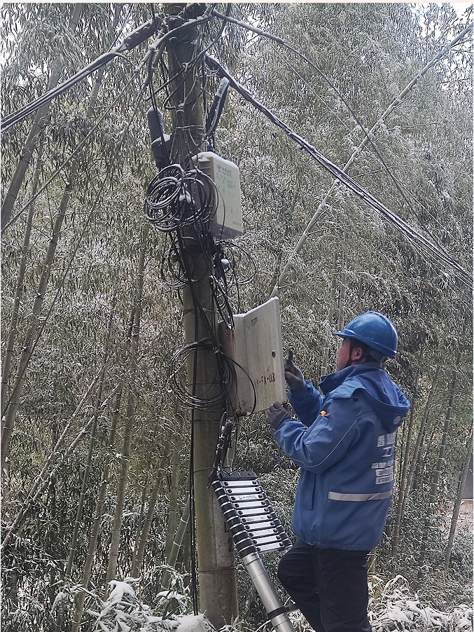 在龙岩,接到光缆故障通知后,分公司应急抢修人员迅速出动,在积雪中徒步3公里赶到故障现场,用手在冰冷的光缆上查找断点,冲缆、上杆、熔纤、挂缆一气呵成,高效有力地保障用户网络畅通。