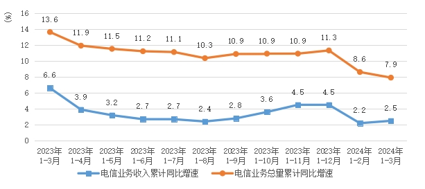 电信业务收入增速小幅回升,电信业务总量个位数增长。1-3月,全省电信业务收入148亿元,同比增长2.5%,增速比1-2月提升0.3个百分点;按上年不变价计算的电信业务总量为133.4亿元,同比增长7.9%。