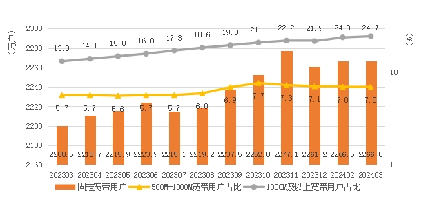 千兆宽带用户保持高速增长。截至3月底,全省(固定)互联网宽带接入用户达2266.8万户,同比增长3%。其中,接入速率在500M和1000M之间的宽带用户159.6万户,同比增长27.3%,占总用户数的7%;接入速率在1000M及以上的宽带用户560.3万户,同比增长92.1%,占总用户数的24.7%。