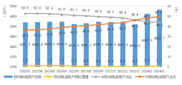 5G用户占比近五成。截至3月底,截至3月底,全省电话用户达5651.1万户,同比增长0.7%,其中固定电话用户667.4万户,同比下降0.8%;移动电话用户4983.7万户,同比增长0.9%。4G移动电话用户达2202.1万户,占移动电话用户总数的44.2%;5G移动电话用户达2464万户,同比增长36%,占移动电话用户总数的49.4%。