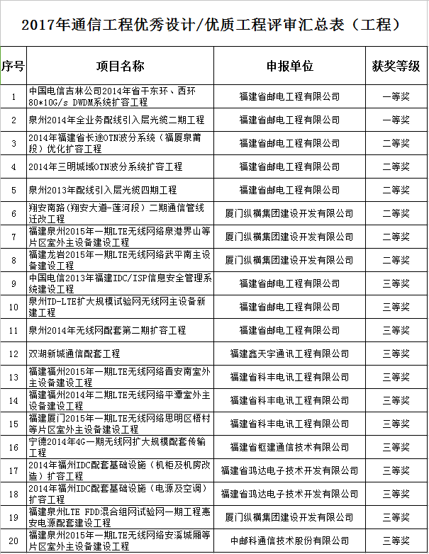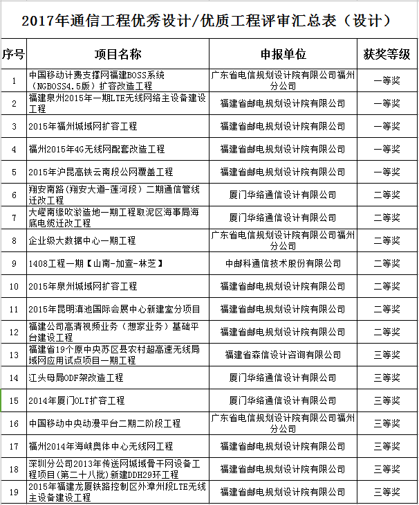 2017通信工程优秀设计/优质工程评选活动经福建省通信学会、福建省通信行业协会评选委员会办公室预审、专家组评定及评选委员会的审定,现将获奖名单公布如下,此名单从发文日起在福建省通信学会、福建省通信行业协会网站公示,公示期为7个工作日,在此期间,如有问题或情况反映,可与福建省通信学会、福建省通信行业协会联系。