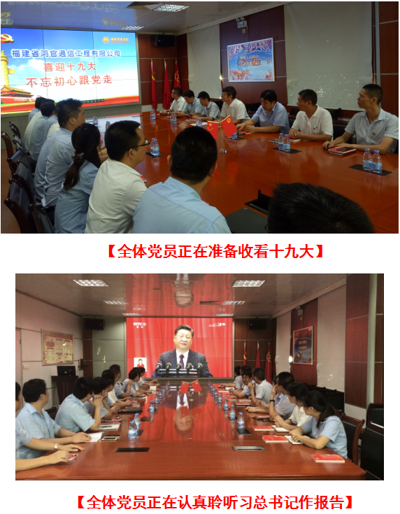 10月18日上午09:00,福建省鸿官通信工程有限公司晋江总部三楼党建室座无虚席,党支部书记、董事长翁长官,晋江市党代表、总经理翁国文同总部全体党员与入党积极分子欢聚一堂,一起收看十九大开幕式盛况,各驻地项目部党小组也同时分别组织收看。