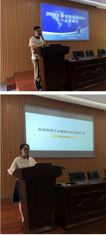 会上,四位教师分别代表公共课程教学部、计算机专业教学部、经济管理专业教学部和通信技术专业教学部作交流发言。他们以PPT搭配演讲,介绍了福建鸿官、厦门大拇哥、福建国科、北京络捷斯特等四家公司的企业文化、经营理念等相关情况,分享了自己在企业实践中的收获和体会,并根据调研情况,对学校专业教学改革和人才培养优化提出了建议。