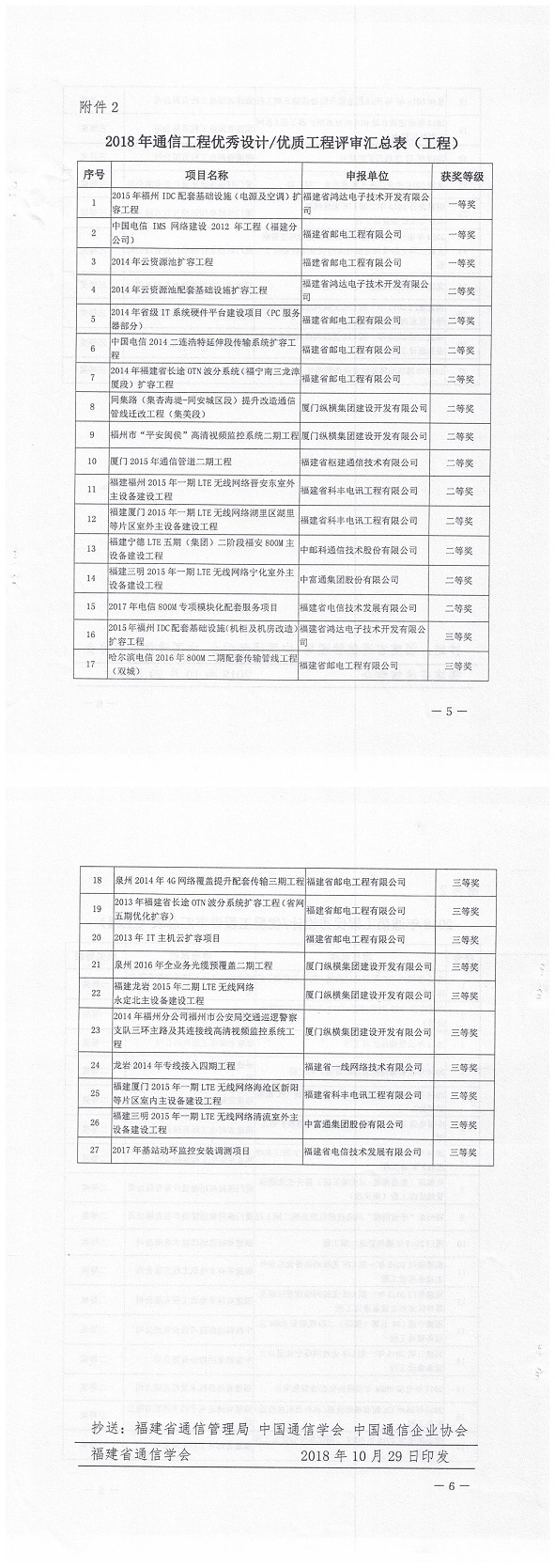 关于“福建省2018年通信工程优秀设计优质工程奖”评选结果的通知