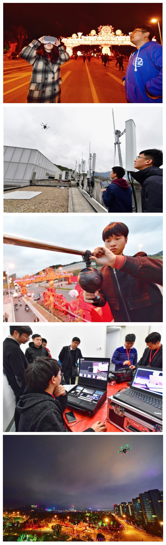 联通技术人员介绍,灯会现场的无人机VR和地面固定VR设备,通过拍摄6-8路4K高清视频进行拼接和视频解码的处理后,再通过5G网络极速回传,从而呈现360度的全景影像。VR技术对宽带和延时有非常高的要求,回传速率的要求达到200-300Mbps,而5G网络最大带宽支撑可达到10Gbps,完全可以满足VR视频的流畅回传。同时5G网络的超低时延特性保证了视频和现场的高度同步,让用户真正享受身临其境的沉浸式体验。