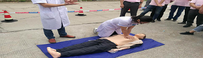 第一场演练为伤员急救 9点30分,各参演人员齐装满员到达野外指定场所,由于该场所靠近马路边,周围不时有行人和车辆经过,负责后勤保障人员一到现场即投入战斗,竖起警示牌,拉起警戒线。不一会儿,三明第三医院急救中心的两位医生和护士也带着仿真模型和急救用具赶来了,他们首先利用仿真模型为大家详细讲解了口对口人工呼吸急救法,胸部按压急救法,伤口简单包扎法,重伤员移动法,毒蛇咬伤急救法等。虽然骄阳似火,但也阻止不了每个员工的学习热情,大家都非常认真的听着两位医生和护士的讲解,并注意着每个动作要领,悉心学习。有的还亲自操作,力求规范。