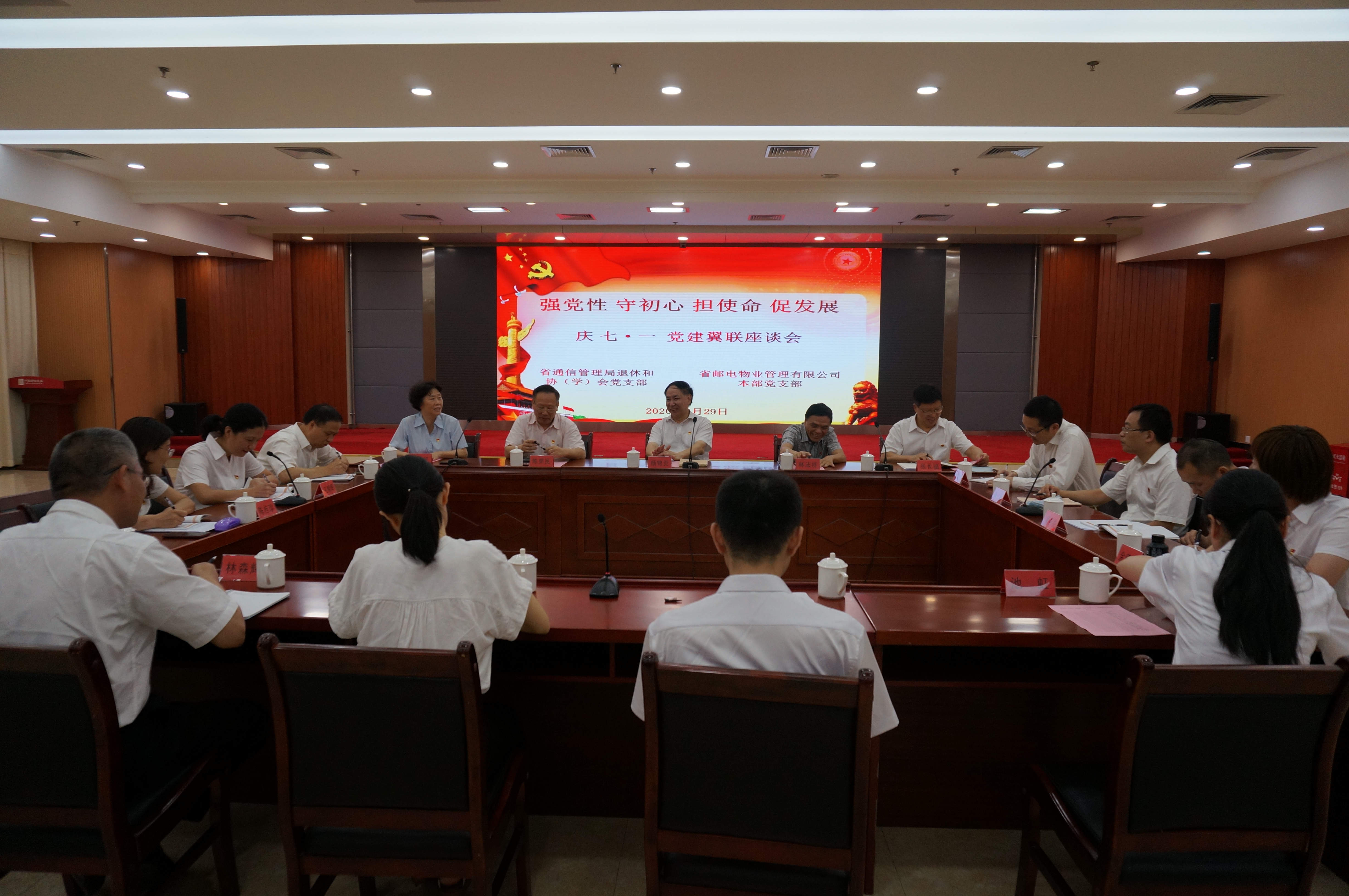 为庆祝中国共产党建党99周年,回顾党的发展历程,歌颂党的伟大成就,做到“不忘初心、牢记使命”,更加坚定理想信念跟党走,6月29日,省通信管理局退休和协(学)会党支部和省邮电物业管理有限公司本部党支部联合召开了“强党性 守初心 担使命 促发展”庆七•一党建翼联座谈会。两支部全体党员参加了会议。